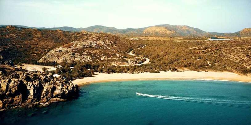 Wir rattern der super Strasse entlang runter zu zwei Buchten an beiden Seiten der Strasse. Was so eine natürliche Verengung in der Landschaft darstellt. Dann wieder einen halben Kilometer weiter und vorbei durch einen Zaun der quer über die Landschaft das Gebiet in zwei Hälften trennt. Die gute und die nicht geht Seite. Bewacht von einer Hundehütte am Strassenrand, mit deutschem Schäferhund davor, der etwas in der Sonne rum blinzelt. Und vermutlich auf griechisch Hasso, Nero oder pack den Mann heisst. Aber er ist eine Sie und sie ist nett und wedelt sogar. Sie passt hier auf, dass niemand zu Fuss in das Sperrgebiet reinwandert, im Gegenzug dazu gibt es regelmässig etwas Futter.