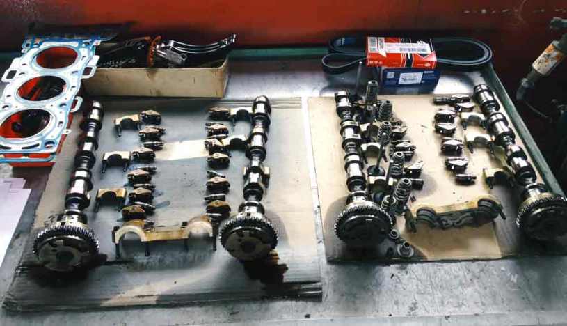 muss all das hier abgebaut werden. Alle vier Nockenwellen. Super.