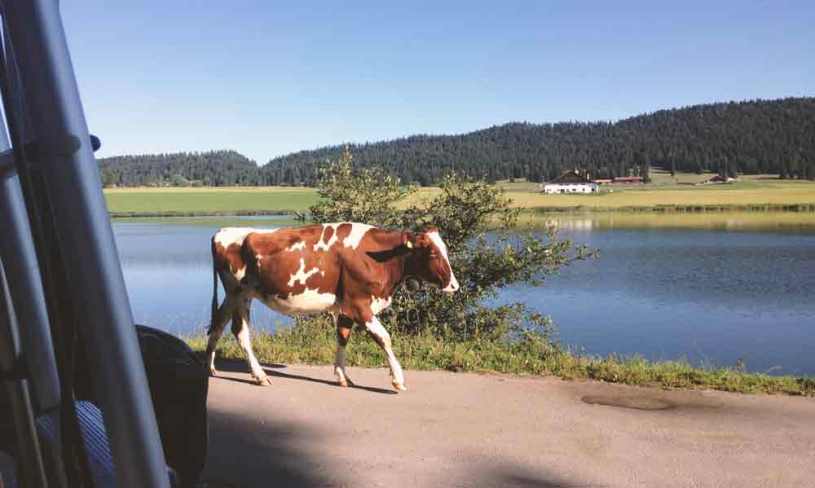 Wir sind gestern tief in der Nacht vom Atelier in den Jura gefahren um dort frische Luft zu schnuppern und zu arbeiten. So gegen August geht die Sonne hinter den Bäumen etwas später auf, also muss die Stromernte auswärts erfolgen. Und so um acht Uhr trappen die Mädchen vom Bauernhof oben, wie immer gemächlich und Gras zupfend, an unserem Bus vorbei.