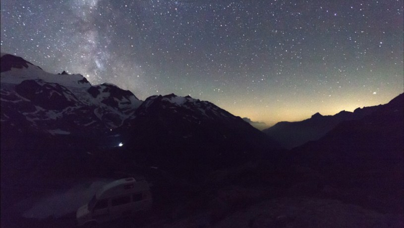 ich die Nacht der guten Sicht hier oben. Der Nebel war so um die 10ne Abends weg, ich starte die Zeitraffermaschine und geh mal zum Bus runter. Um dort zu pennen. Um sechs in der Früh juck ich raus aus den Federn und geh die Kamera checken. In Erwartung einer grandiosen Zeitraffer Sache. Da waren dann ganze 12 Bilder auf der Speicherkarte. Etwa so um die 820 hätte ich erwartet. Es hat nicht wollen sein. Offenbar.