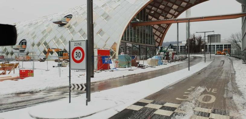 Einen Kaffee später rollen wir endlich. Die Landschaft ist leicht anschneit, an diesem frühen Tag. Ist immer so. Es schneit, wir fahren. Wir könnten auch einen Tag früher fahren. Haben wir aber wieder verpasst. Wir kurven beim neuen Swatch Gebäude vorbei. Sind gespannt wie das in einem halben Jahr dann ausschaut. Die bauen schon ordentlich lange dran rum. Ist aber auch etwas kompliziert das Teil, so zum bauen.