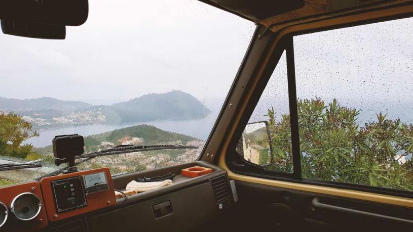 Das ist hier genau richtig. Wir verlassen den Bus nicht ein einziges Mal. Der Bus ist unser Zuhause. Besonders bei Regen.