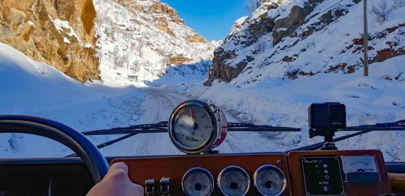 Ab hier gehts kräftig den Berg hoch. Und es hat auf der anderen Seite vom Pass natürlich auch geschneit. Aber ein paar Schneerutsche haben die Strasse geschlossen. Morgen gegen Mittag werden sie die Strasse wieder räumen. Das können wir in Erfahrung bringen. Wir sind nicht die einzigen Reisenden die hier festsitzen. Ein Kleinbus steht auch hier. Wir parkieren mal etwas um. Und richten uns auf eine weitere Nacht hier in dieser frisch verschneiten Gegend ein.