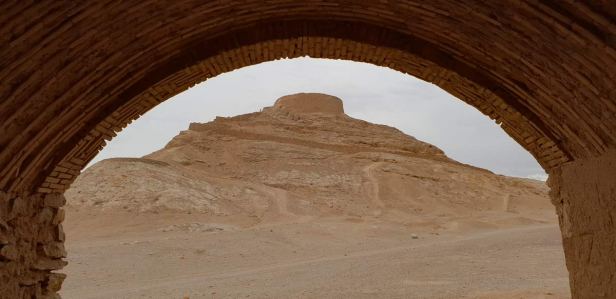 stehen wir endlich und schauen uns diese Stätte an. Der Begriff “daḫme” ist persisch und bedeutet ein etwas grösseres Grab. Vor allem Bauwerke, die auch als Türme des Schweigens bekannt sind, werden dem Wort gerecht. Und den Zoroastrien dienten diese Bauwerke als Stätten für die Himmelbestattung. Also nicht von den Würmern fressen lassen, sondern eher von den Vögeln. Und die fliegen ja in den Himmel hoch. Fast zumindest.