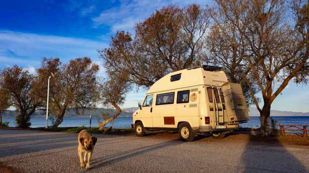 Es ist dann doch mal genug gefahren für heute, wir finden in der Nähe einer Airbase, also so einem Armeeflughafen, einen Platz für die Nacht. Das Dorf vorne ist halb verfallen und verlassen. Einen Campingplatz hätte es auch, aber wann der zum letzten mal offen hatte ist schwer zu erraten. Zwei Leute welche Hunde füttern wissen es auch nicht so genau. Und Hunde hat es hier mehr als genug.