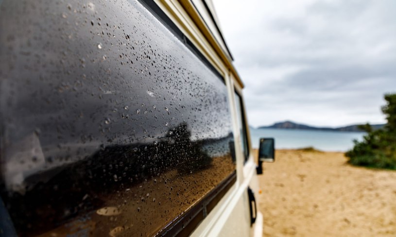 An solchen Tagen kommt wenig Energie vom Solarpanel runter, aber seitdem wir das kostbare Gut in LiFePo4 Akkus lagern, kann gearbeitet werden. Der Arbeitsplatz gestaltet sich einfach und ist direkt bei der Küche. Eine externe Festplatte speichert das Zeugs, eine zweite sichert das Resultat. Mit einem linearen Monitorkopfhörer kann man das Werk belauschen.