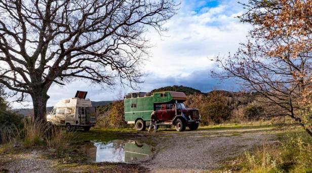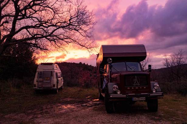 Die beiden Leute im Deutz haben den grossen Diesel angeworfen um nach Deutschland zu fahren. Birgitt muss wieder an die Säcke, das nach einem Jahr hier in Griechenland. Klaus wird wohl den Staub der gesammelten Motorräder abwischen wollen, aber so richtig motiviert sind beide nicht, zurück zu fahren.